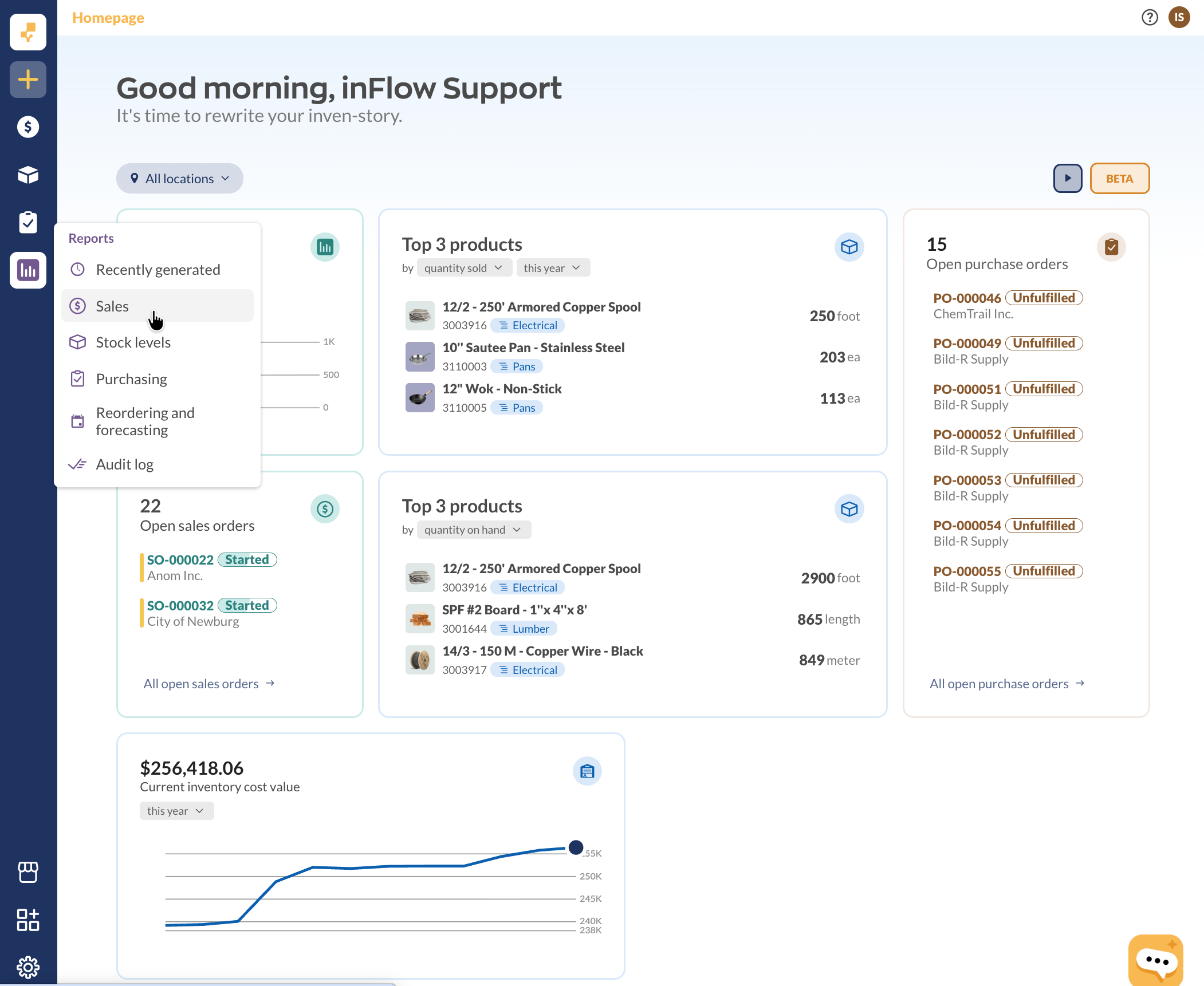 inFlow offers a variety of reports to view financial and inventory information. Each report has various settings you can use to customize its content and layout to suit your needs.