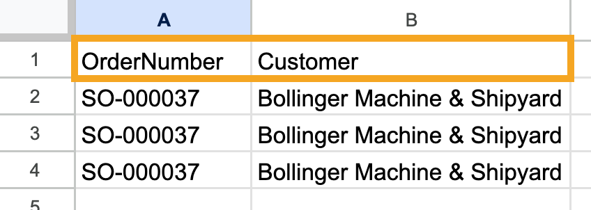 - Fill out the order number column with the sales order numbers that you want to update. If this column isn’t filled out, inFlow will create a new sales order during the import.
