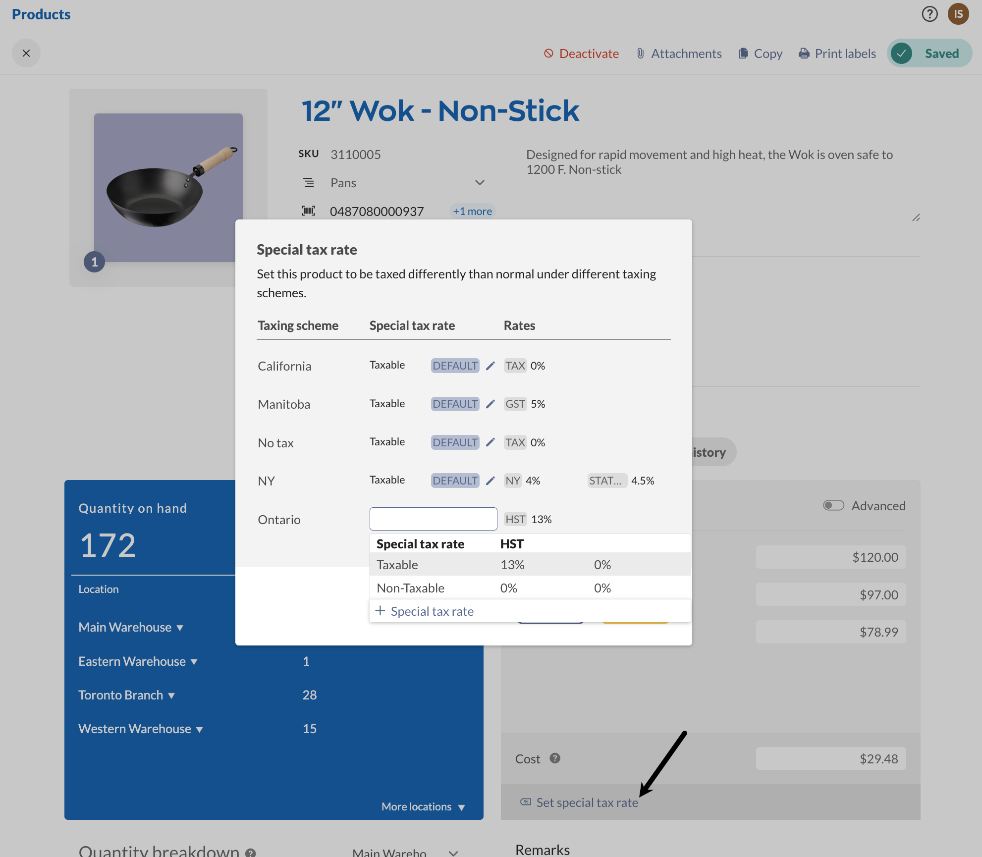 Special tax rates apply different taxes to products in the same order in inFlow. They are specific to the product and can be set up so that each item is taxed differently (ex, Non-taxable, Taxable, GST only, etc).