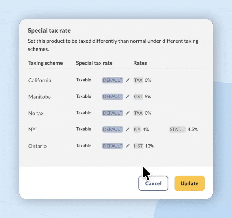 - Select the pencil icon in the Special tax rate column to select how the product should be taxed for each taxing scheme.