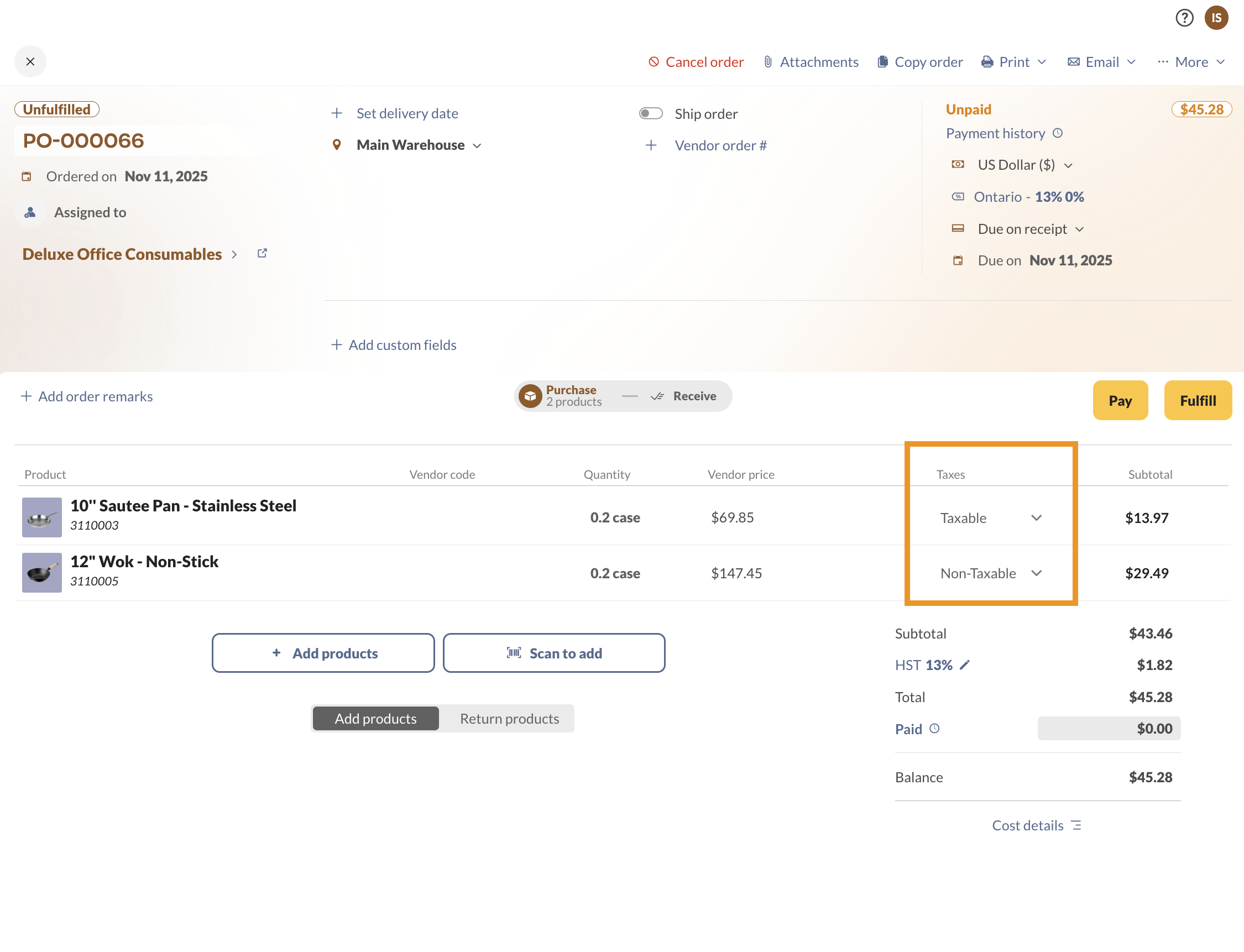 Once you’ve added the special tax codes to inFlow, products in the same order can be taxed differently.