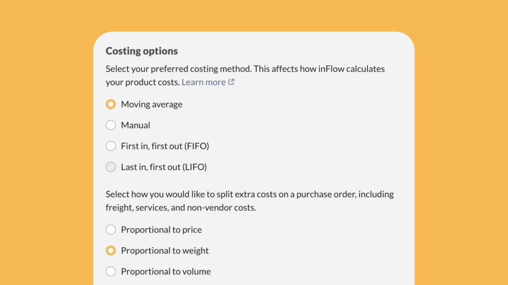 We’ve added new options to split extra costs on POs by price, weight, or volume. You can find these under your Costing options.