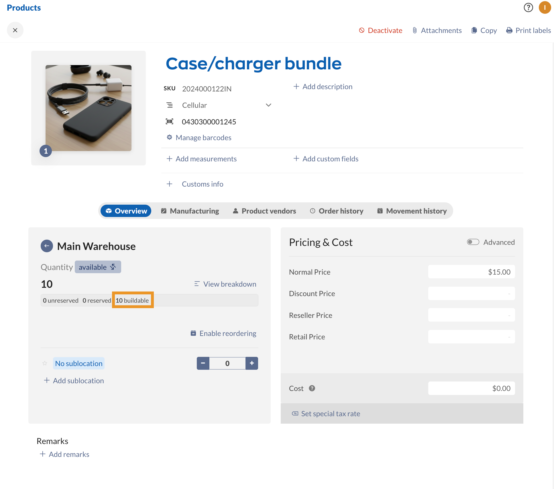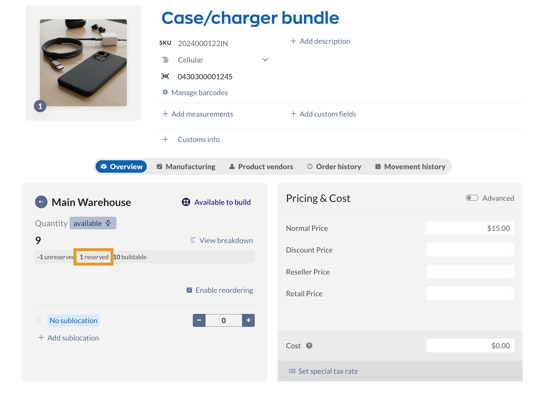 - Case/charger bundle $15.00 – Quantity: 10. This quantity is based on how many bundles inFlow can create, with 20 cellphone cases and 10 charging cables in stock.