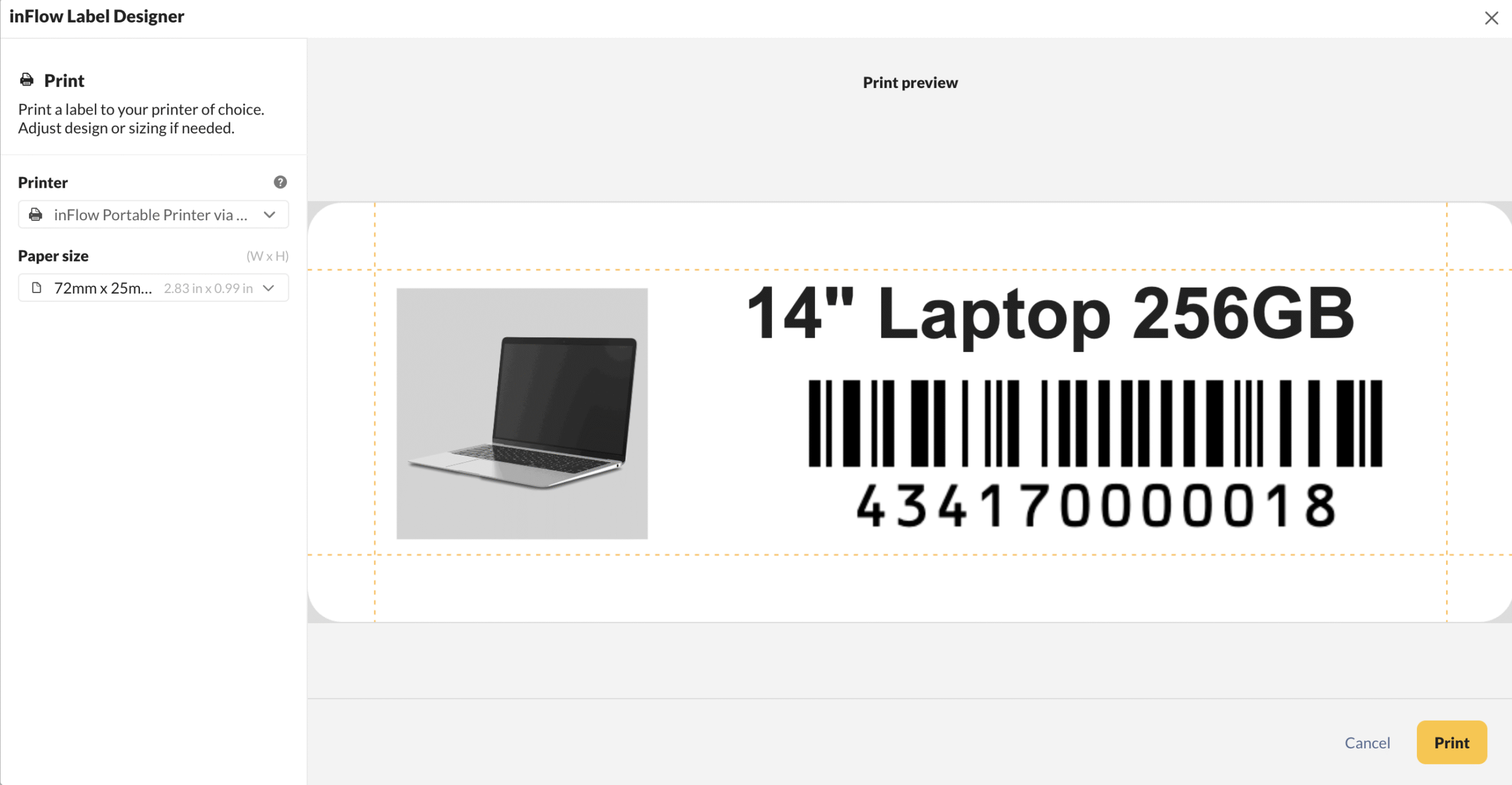 Printing labels from the inFlow Label designer