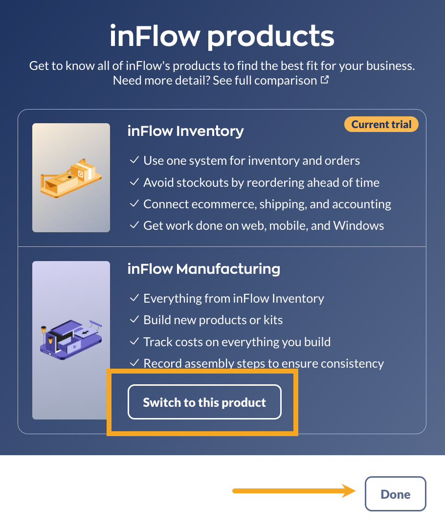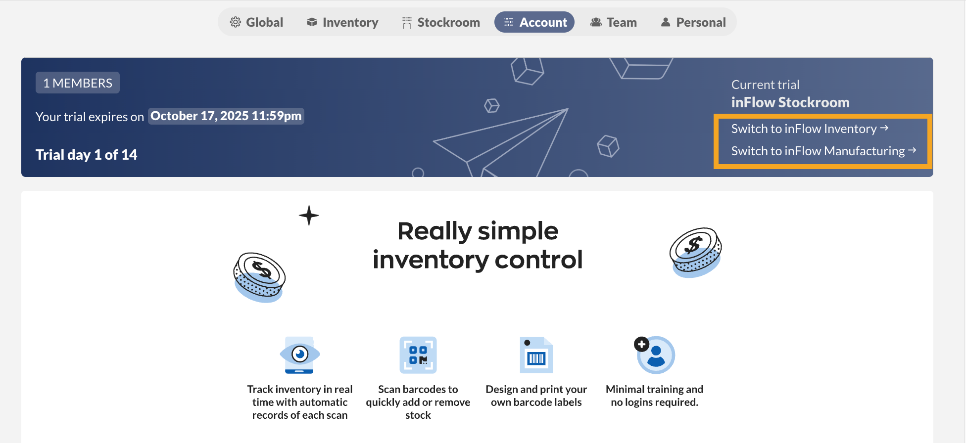 During the signup process, you would have been directed to try Stockroom, inFlow Inventory, or inFlow Manufacturing. If at any point you’d like to try the other option, take a look at the steps below to switch your trial.