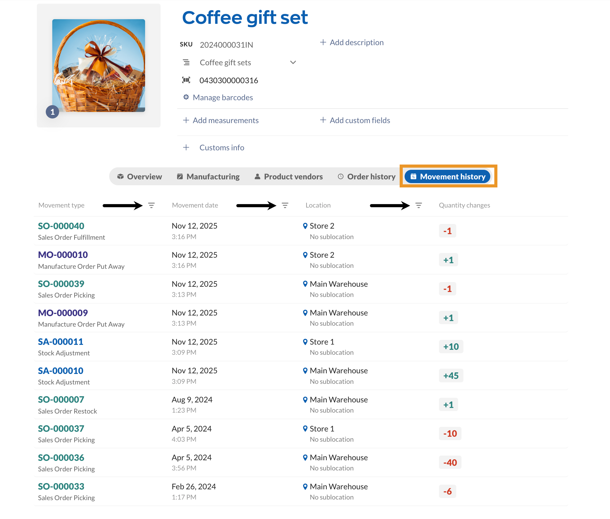 The Movement history tab displays your last 100 stock change entries, including all orders, stock transfers, and adjustments.