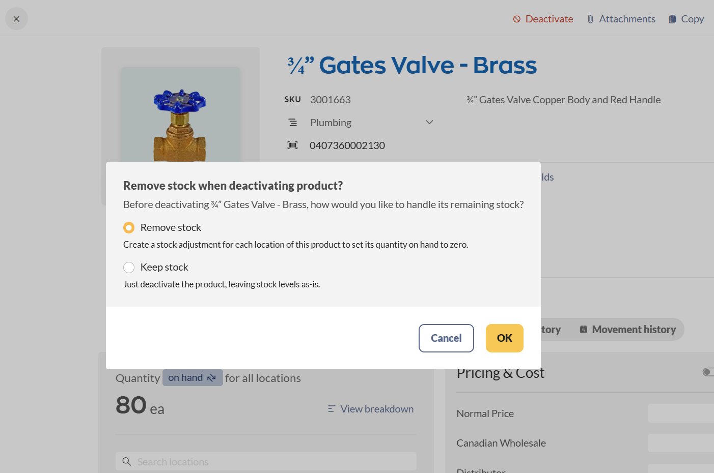 - If this is a product record, you will be prompted to either remove all or keep the current stock. If you keep the stock, then inFlow will still show the record in your Current stock window. You can always zero out your stock at a later time.