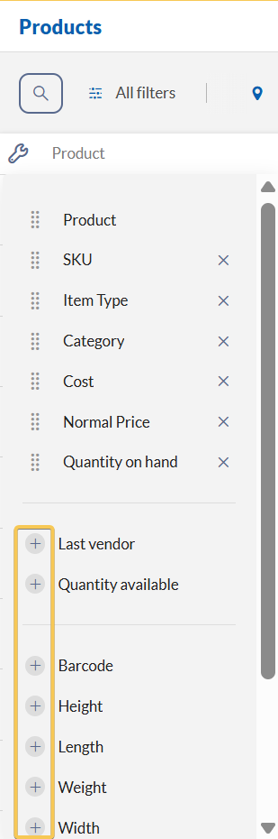 Click the + icon next to a column header to add it to the product list.
