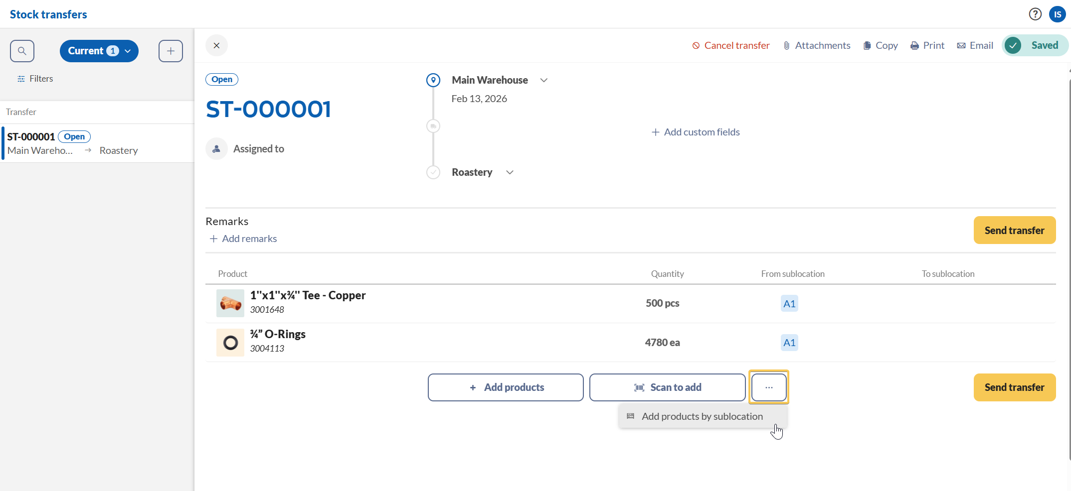 - When you’re done selecting the products, click outside the drop-down menu to continue processing the stock transfer. You can edit the quantity and the sublocations from here.
