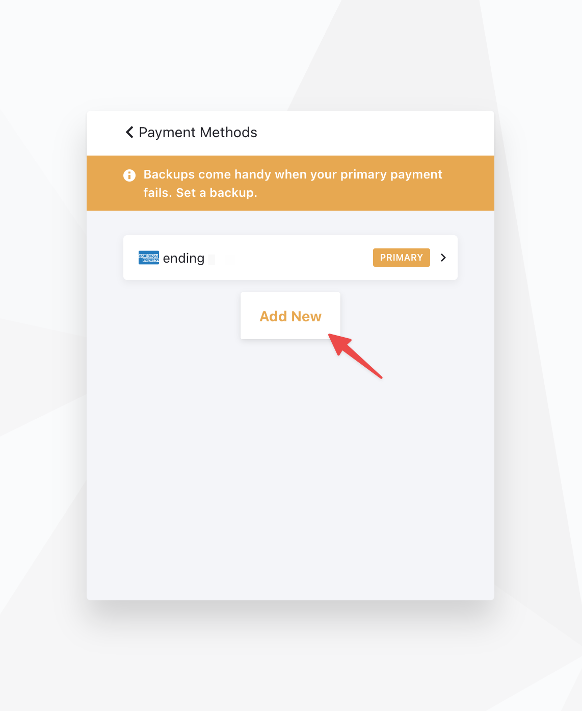 - Click on Payment Methods, then click on the existing credit card to edit the details or click on Add new.