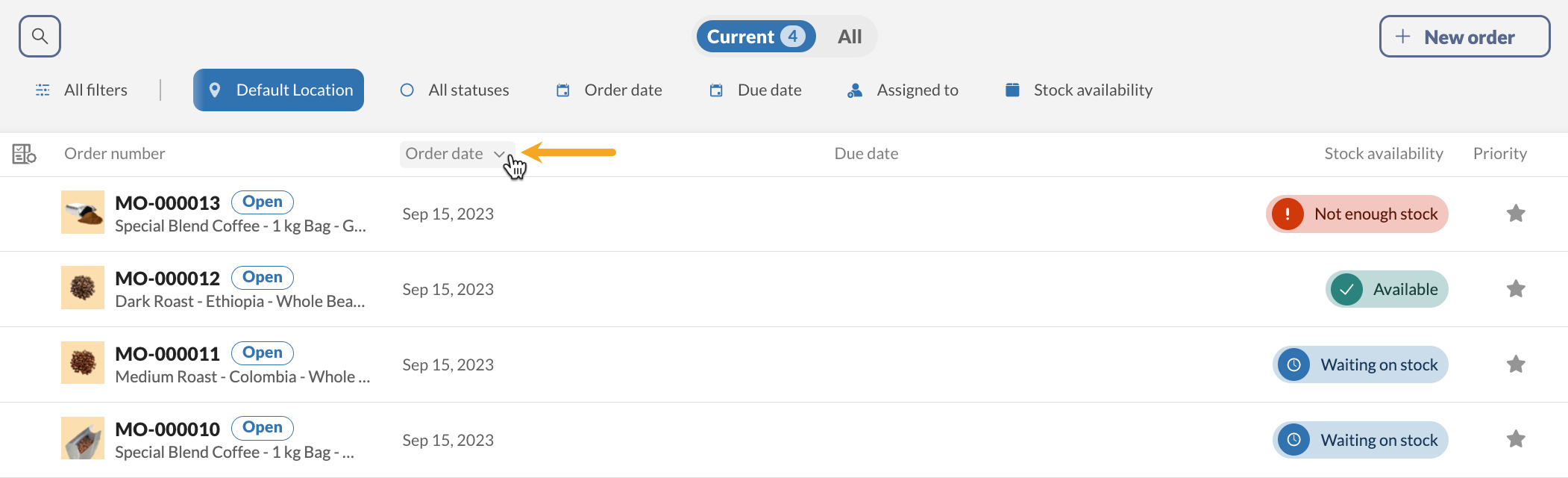 Below the order view, you can use additional filters to find the MOs you’re looking for.