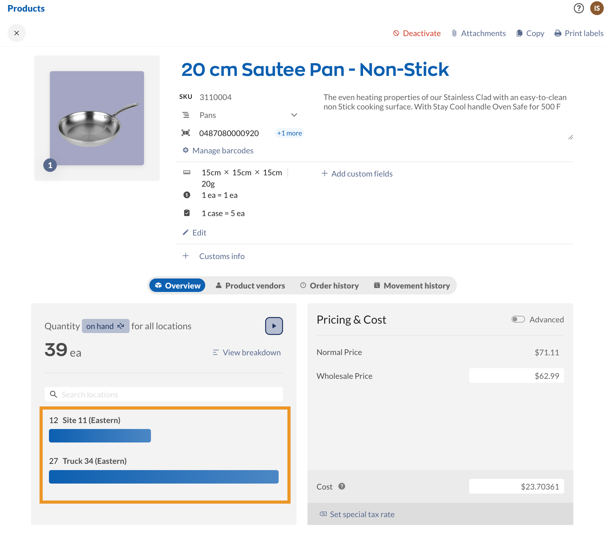 On a specific product’s details page, only locations with access will display inventory. This also affects the Quantity on Hand displayed here; as a result, different team members could see different quantities on hand for the same item if they have access to different locations.