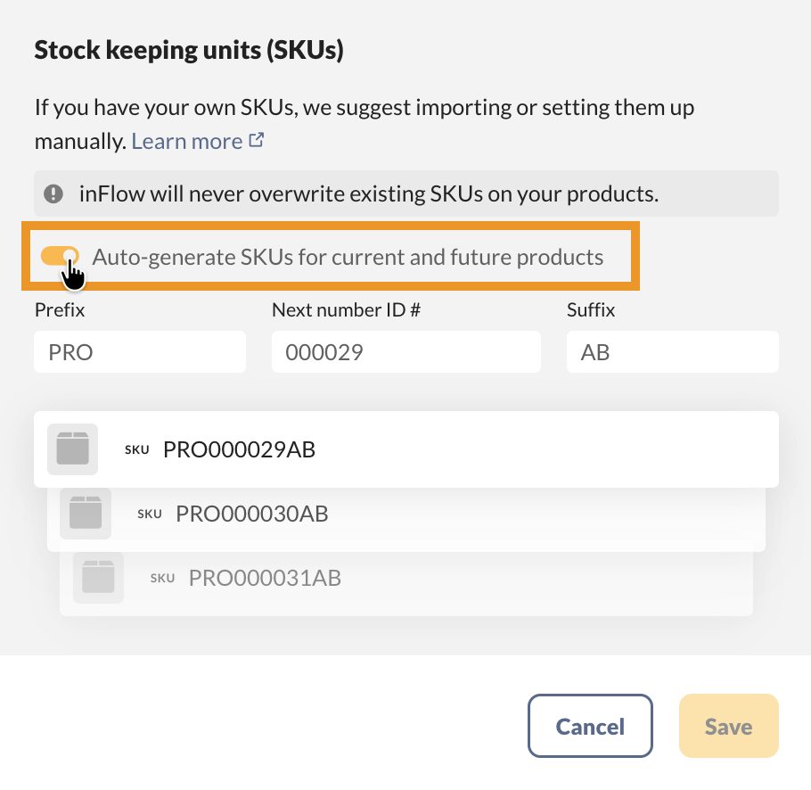 Temporarily disable SKU & Barcode generation in inFlow settings (optional)