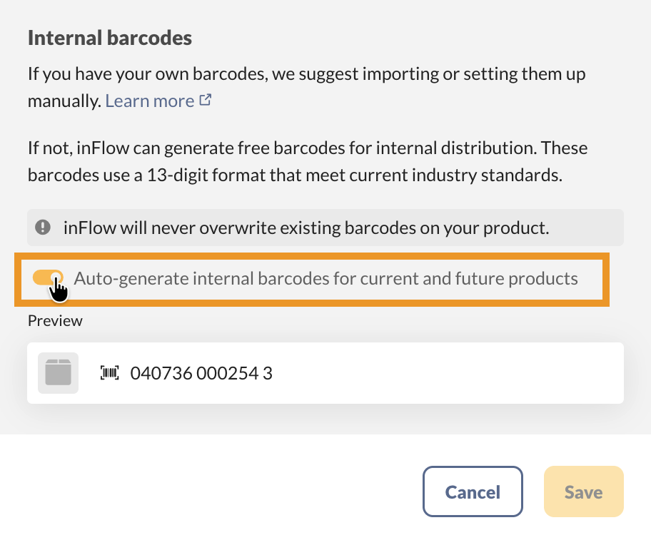 - Toggle on Auto-generate internal barcodes for current and future products.