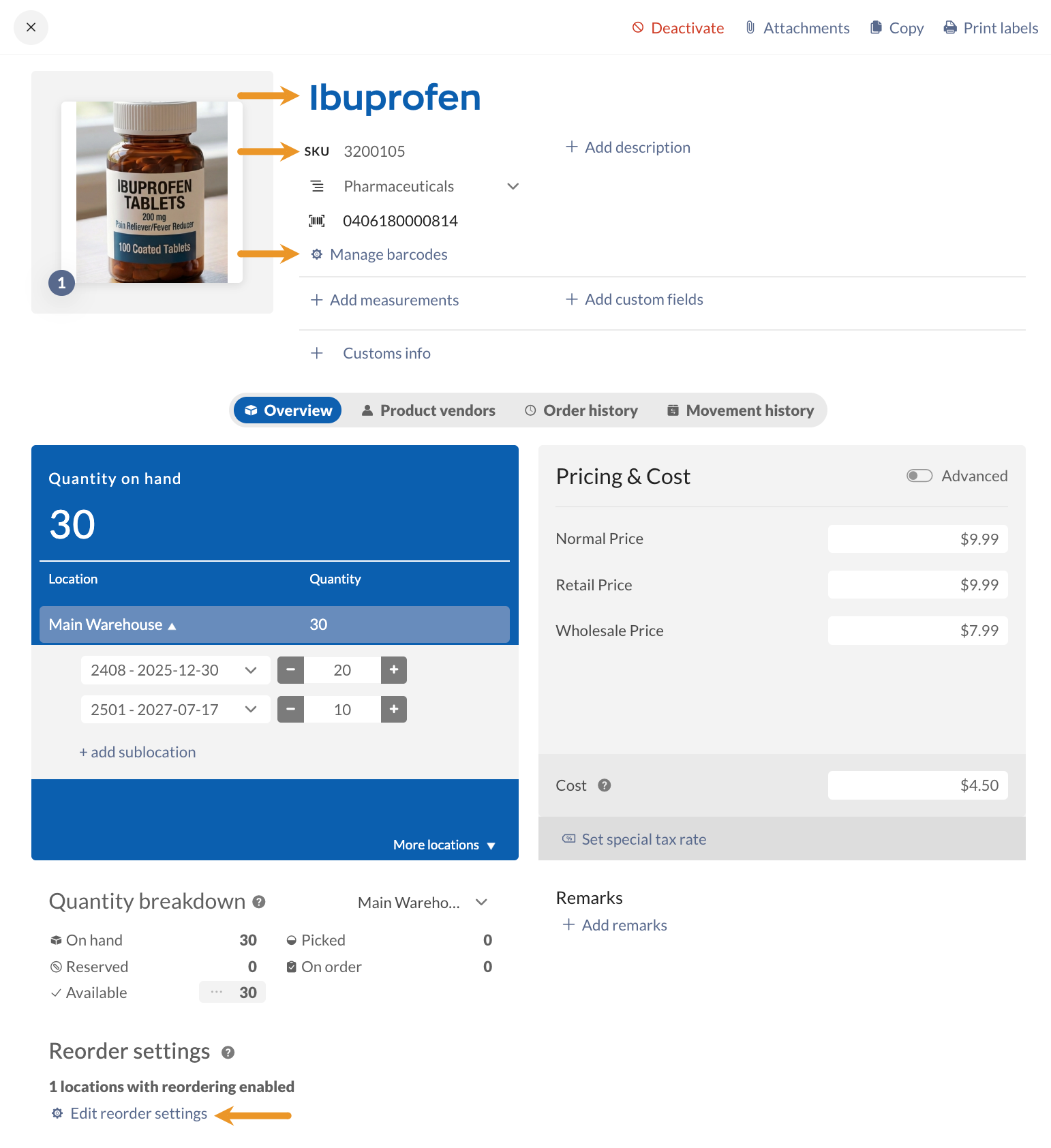| Barcode | Click Manage barcodes to copy or remove a barcode, then reuse it on the new lot product. |