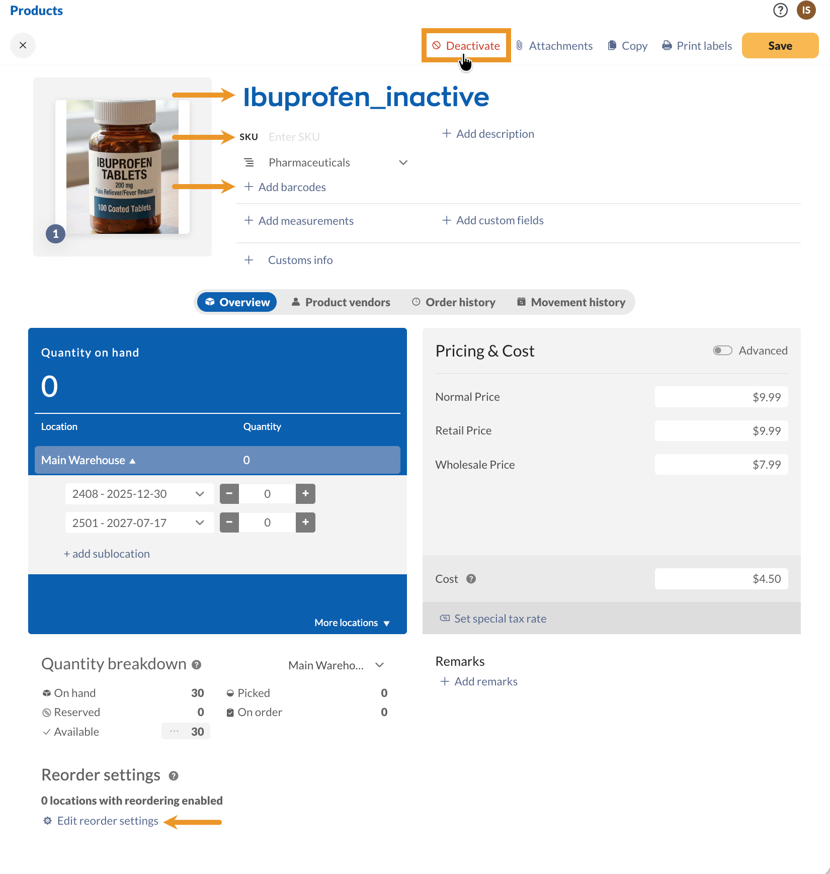 | Reorder settings | To make sure your team discontinues use of the old lot product, open the reorder settings and turn them off. |