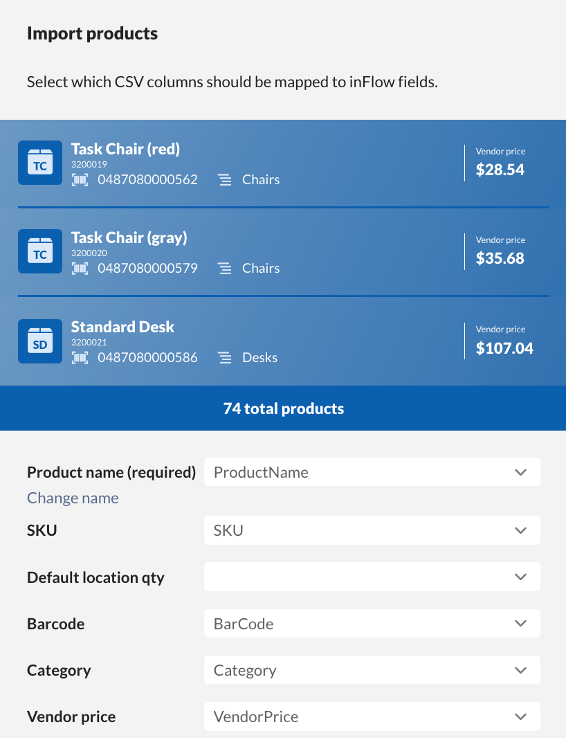 - Match the inFlow fields on the left with the correct options in the drop-down menu. Fields such as Cost and custom pricing schemes must be matched manually.