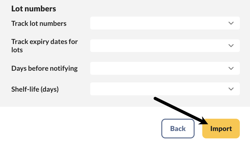 - At the end of the import mapping screen, you will see a Lot numbers section. Leave these fields blank to ensure you do not make any changes.