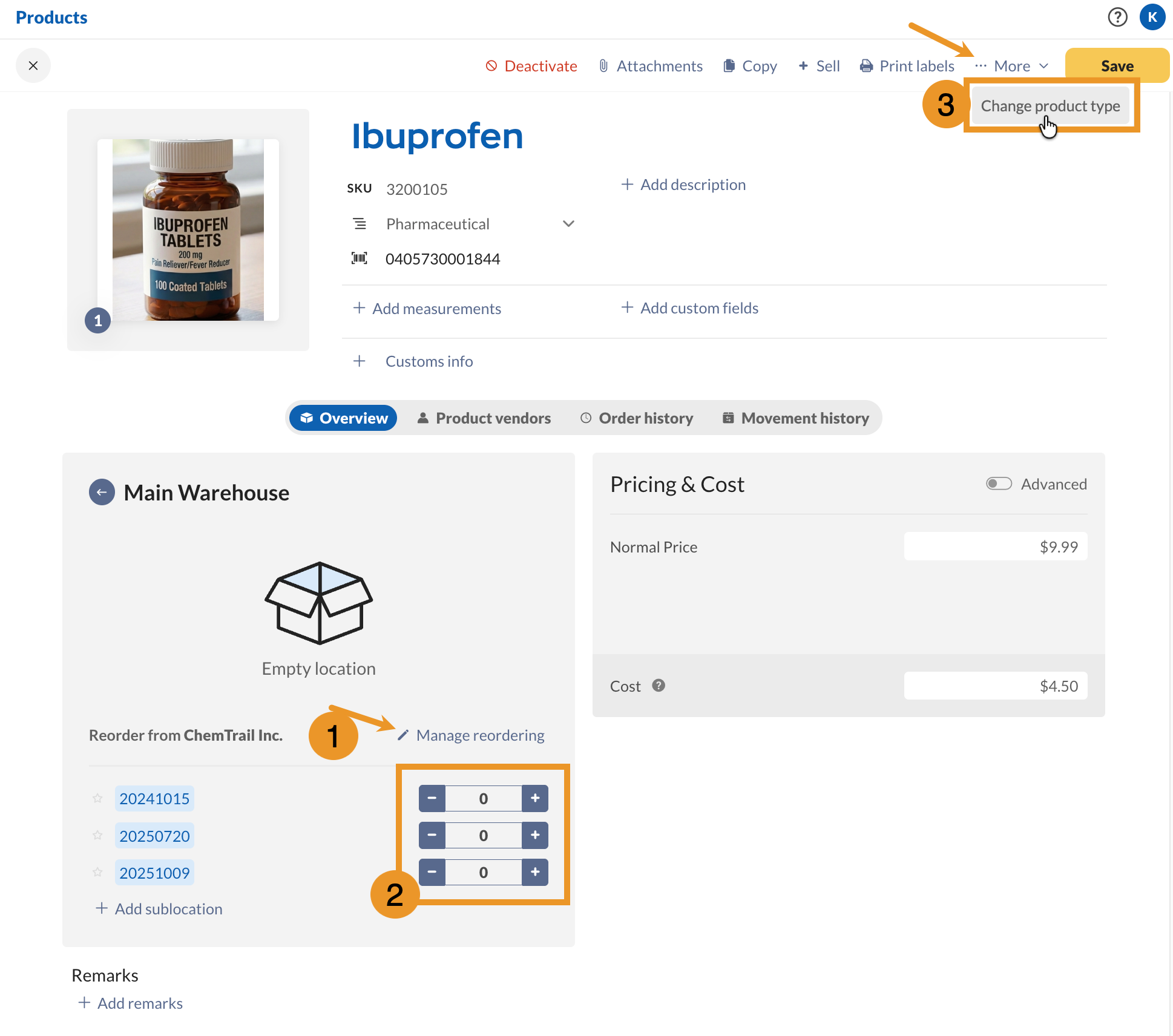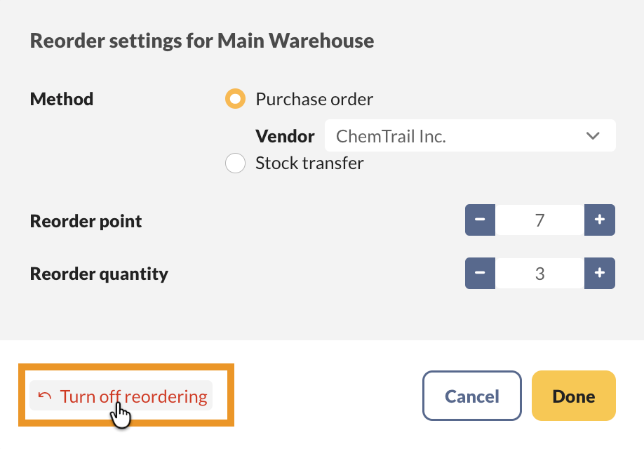 | Reorder settings (Manage reordering) | To make sure your team discontinues use of the old lot product, open the reorder settings and turn them off. |