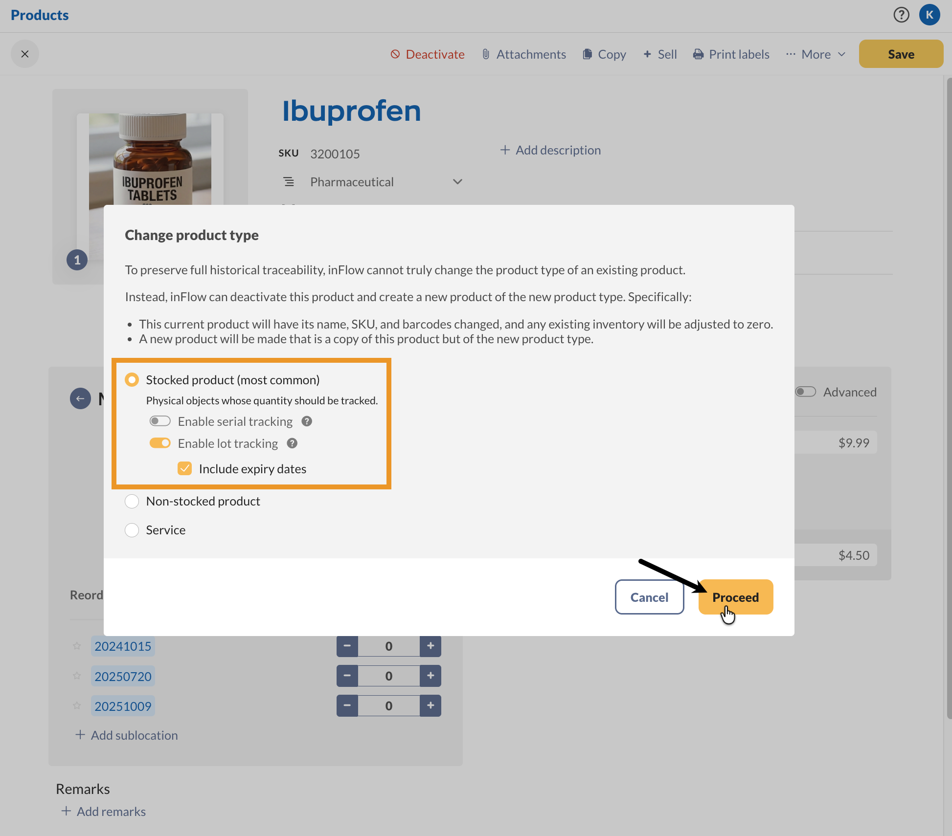 - Click Proceed inFlow will deactivate the old product, and you will now see the record for the new product that replaced it.
