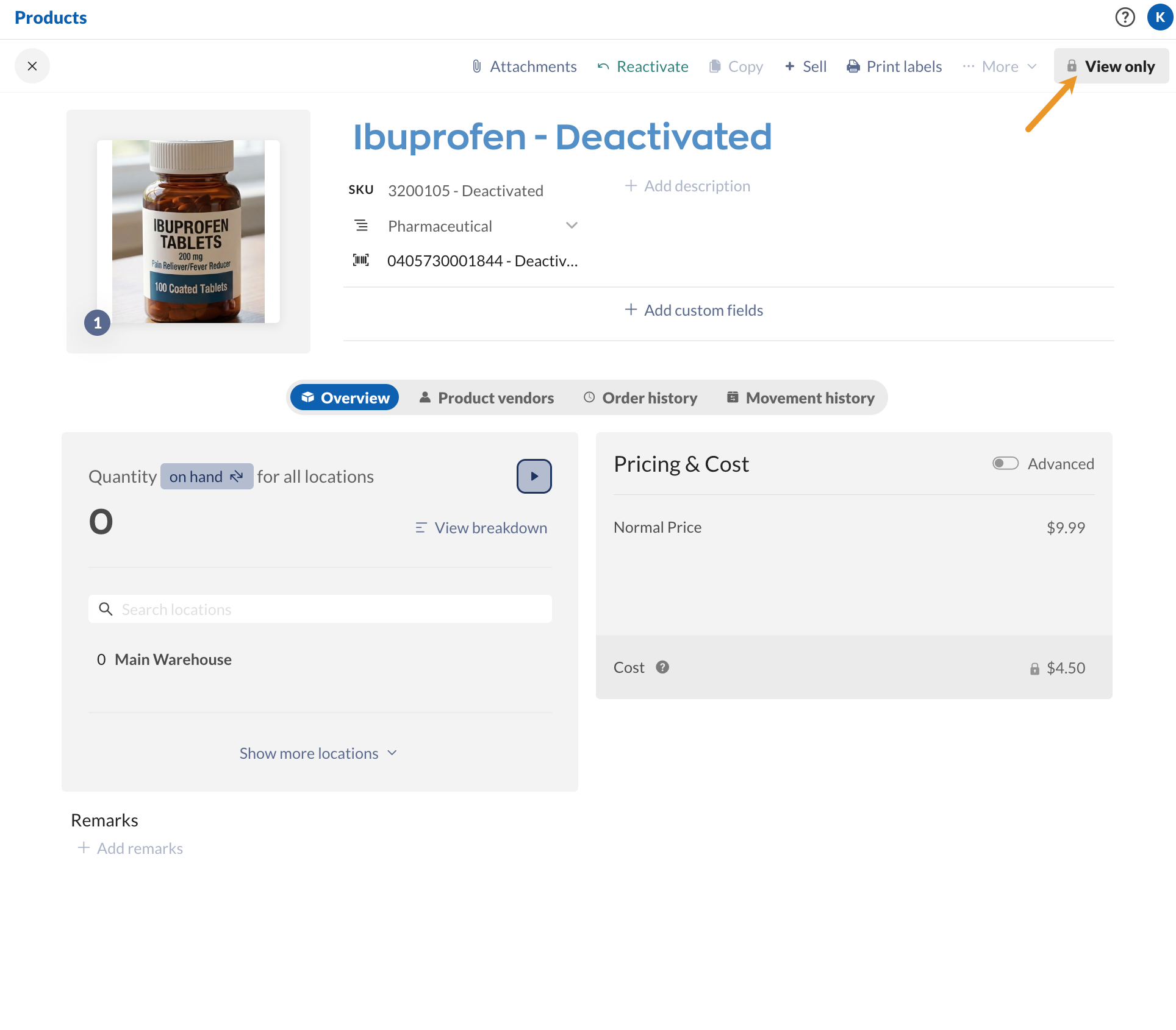 The original product record will show Deactivated next to the product name, SKU, and barcode fields. To view the deactivated product, follow the steps in this guide.