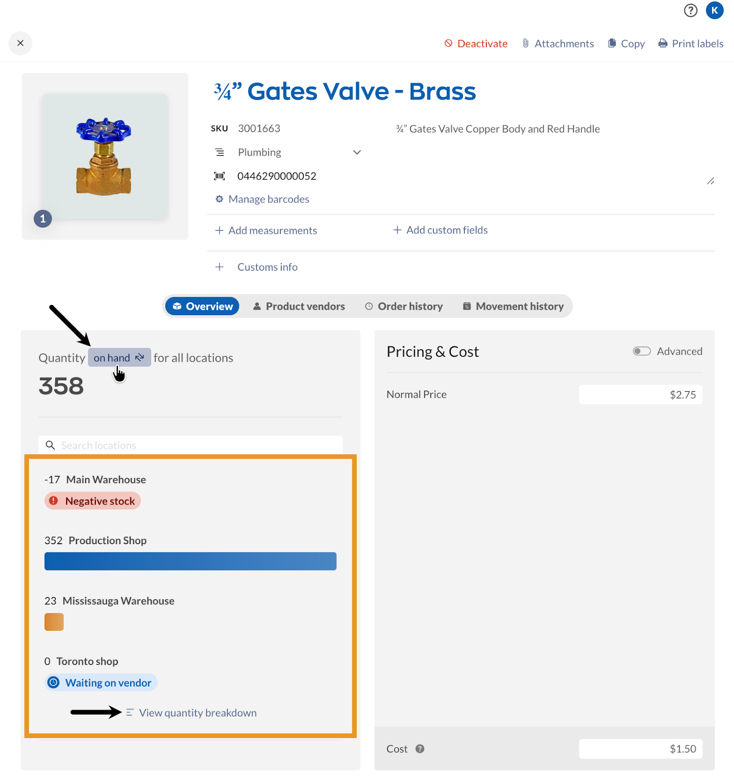 To follow along, these numbers can be found in your product record under the Order History tab. You can look at the information for a specific location or select All locations to view your global quantity (quantities across all locations).